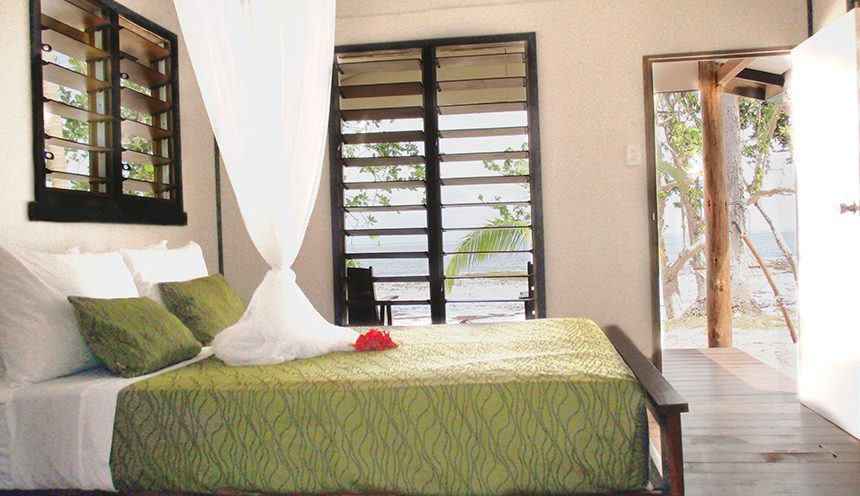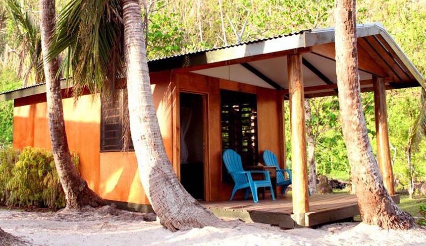 Their Eco-Bures are 100% beachfront! Eco-Bures are stylized safari/Beach huts, purpose built for the outer island Fiji climate. There are eight bures speckled along the beach and nestled under the leaning palms. The rear view is of a jungle-laden mountainside and the front deck overlooks masses of colourful tropical ocean. Furnishings include comfortable dressed beds, deck chairs, clean rain water flush toilets and shower ensuite.