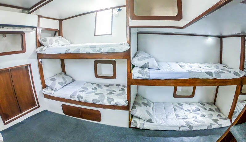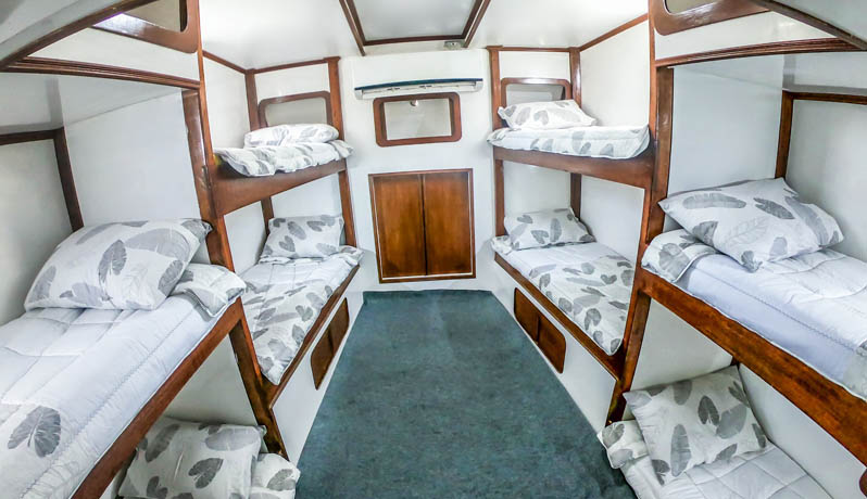 Wave Hunter is 70 feet long with 50mm wood planking making for a very solid vessel. It was rebuilt to accommodate up to 12 passengers (16 on request) with comfort. Two couple cabins and 12 dormitory beds all with AC.
